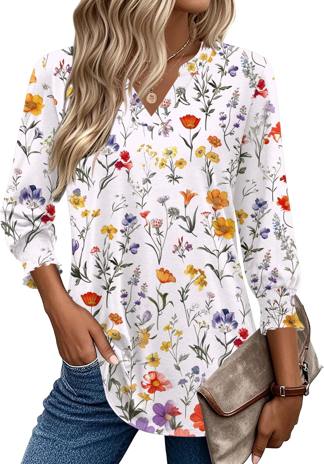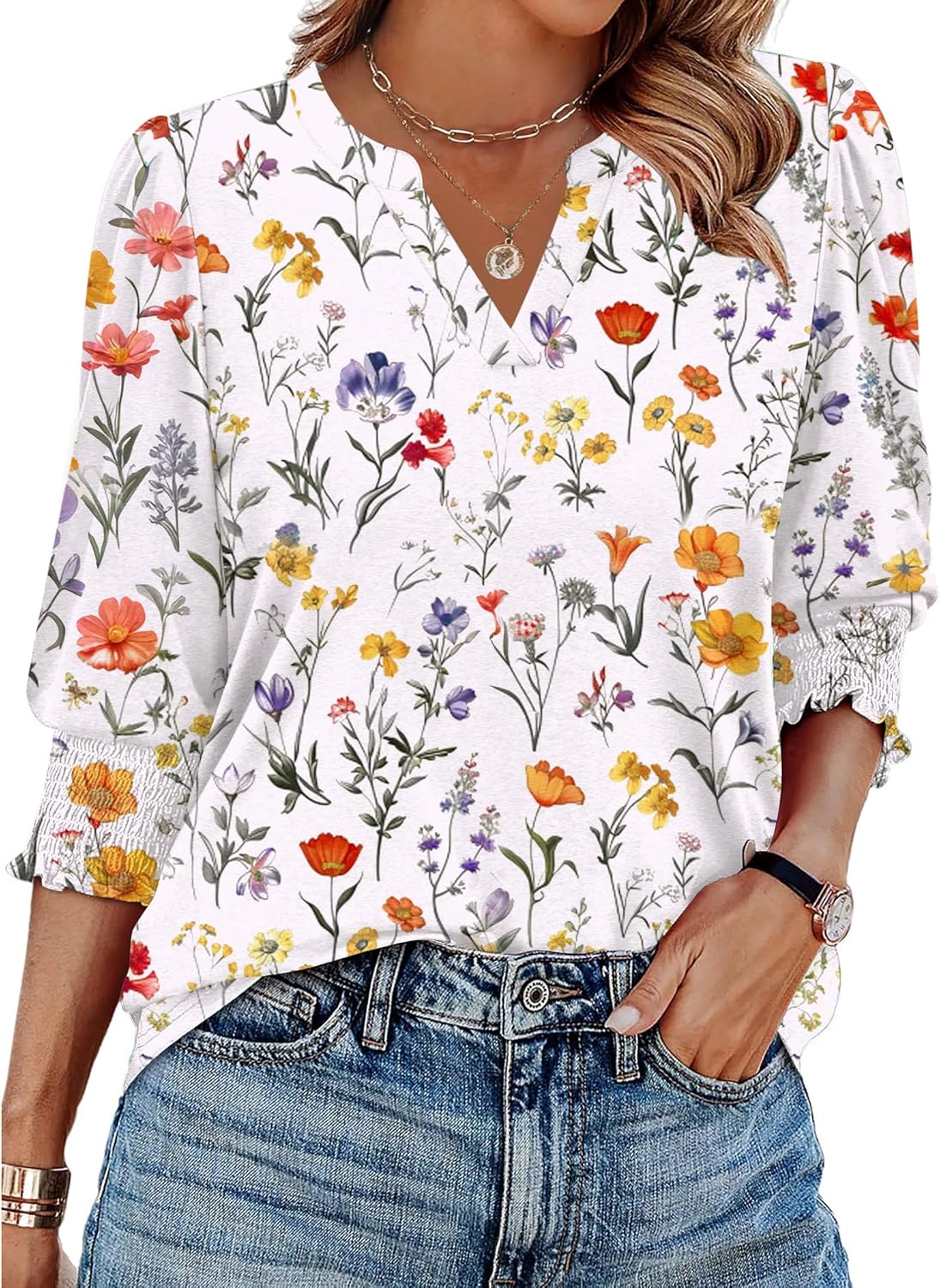 - 【Features】Women’s casual tops, loose fit v neck shirt with ruffles cuffs sleeves, 3/4 length sleeve design is suitable for all seasons